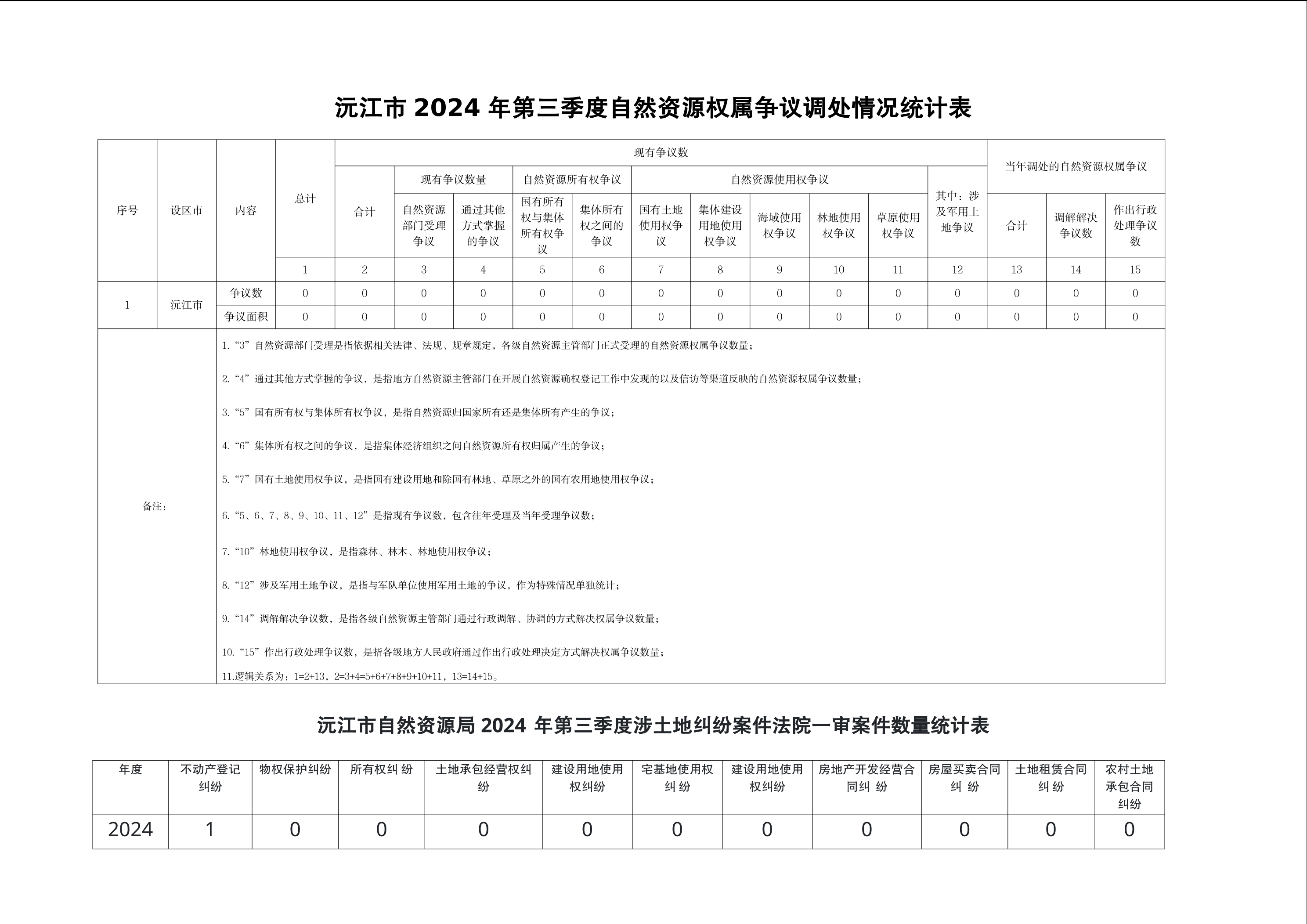 沅江市2024年三季度自然資源權(quán)屬爭(zhēng)議調(diào)處情況和涉土糾紛案件法院一審案件統(tǒng)計(jì)表