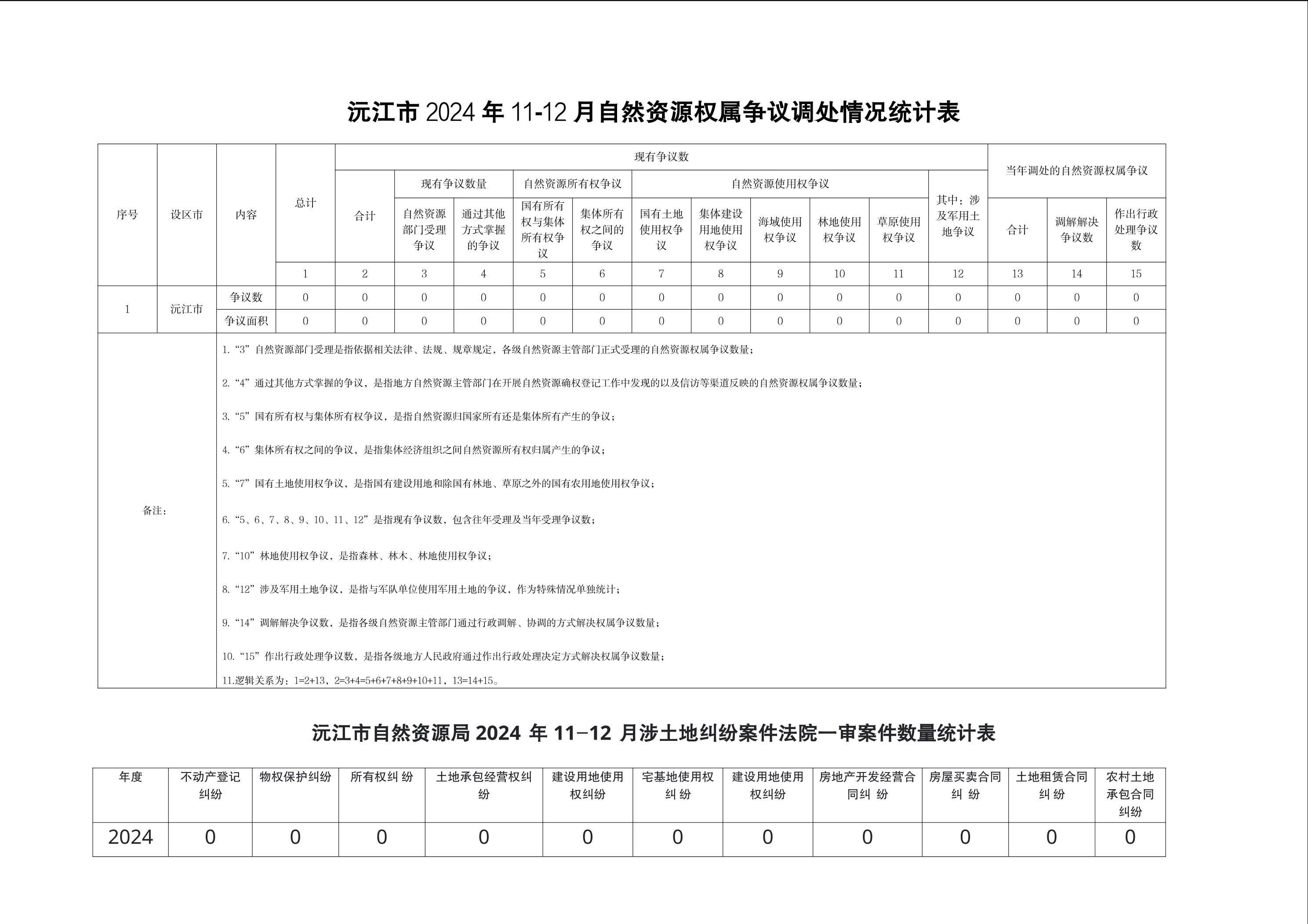 沅江市2024年11-12月自然資源權屬爭議調處情況及涉土地糾紛案件法院一審案件數量統計表