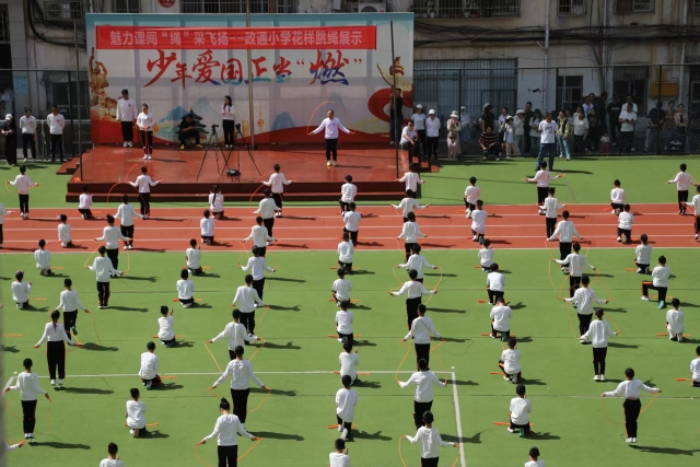 上午10時,政通小學操場上演精彩紛呈的跳繩展演。由1000名學生組成的方陣以《繩舞飛揚》集體繩操開場,整齊劃一的甩繩動作與律動音樂完美契合。一分鐘競速如離弦之箭挑戰(zhàn)極限;花樣跳繩似蝴蝶穿花靈動翩躚;繩操展演若千軍列陣氣勢如虹;彩虹跳繩猶天女散花絢爛蒼穹。師生一同躍動,演繹著教育者與成長者同頻共振的溫情畫面。