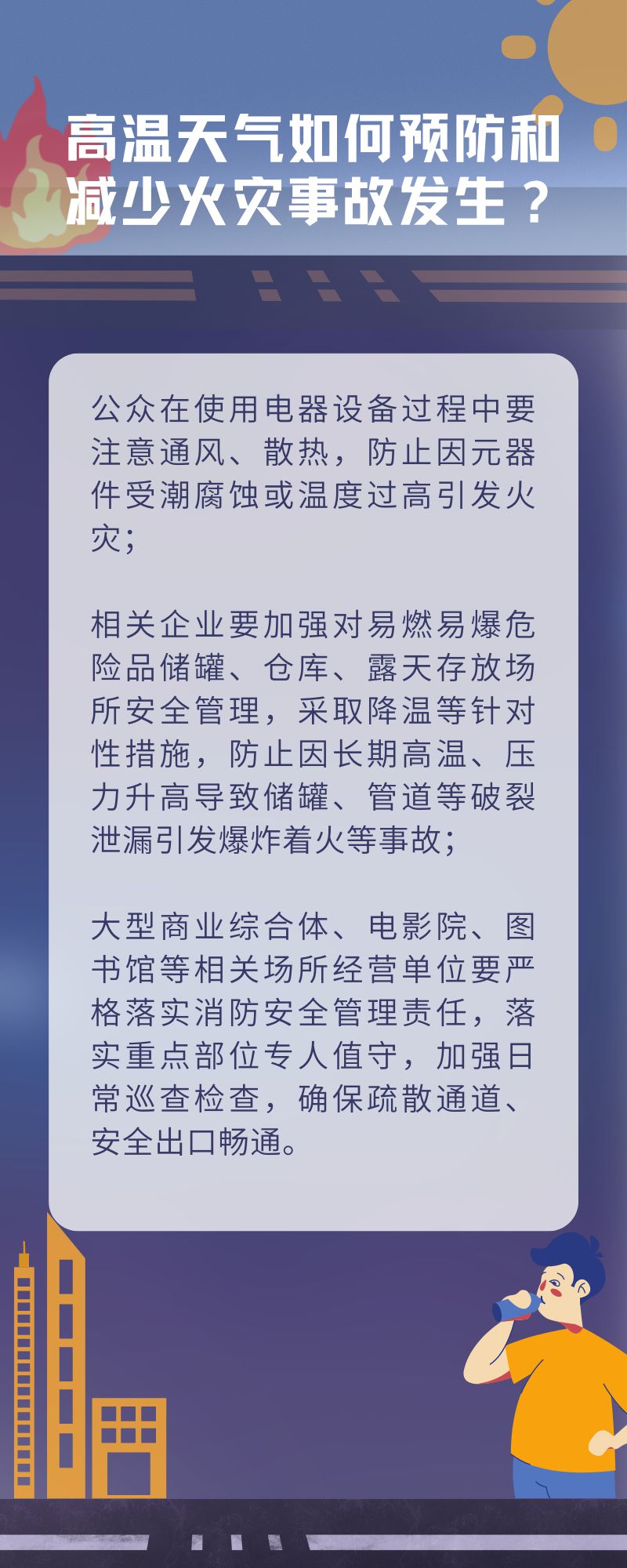高溫天氣如何有效預(yù)防和減少火災(zāi)事故發(fā)生?應(yīng)急管理部消防救援局發(fā)布消防安全提示,公眾在使用電器設(shè)備過程中要注意通風(fēng)、散熱,防止因元器件受潮腐蝕或溫度過高引發(fā)火災(zāi);相關(guān)企業(yè)要加強(qiáng)對(duì)易燃易爆危險(xiǎn)品儲(chǔ)罐、倉庫、露天存放場(chǎng)所安全管理,采取降溫等針對(duì)性措施,防止因長(zhǎng)期高溫、壓力升高導(dǎo)致儲(chǔ)罐、管道等破裂泄漏引發(fā)爆炸著火等事故;大型商業(yè)綜合體、電影院、圖書館等相關(guān)場(chǎng)所經(jīng)營(yíng)單位要嚴(yán)格落實(shí)消防安全管理責(zé)任,落實(shí)重點(diǎn)部位專人值守,加強(qiáng)日常巡查檢查,確保疏散通道、安全出口暢通。