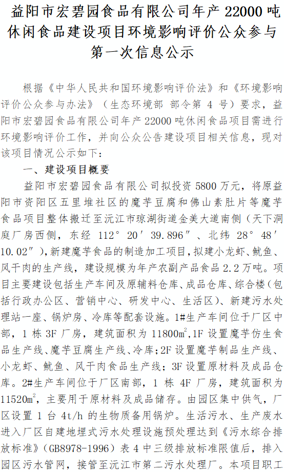 益陽市宏碧園食品有限公司年產22000噸休閑食品建設項目環境影響評價公眾參與第一次信息公示