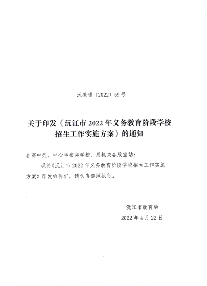 關于印發(fā)《沅江市2022年義務教育階段學校招生工作實施方案》的通知