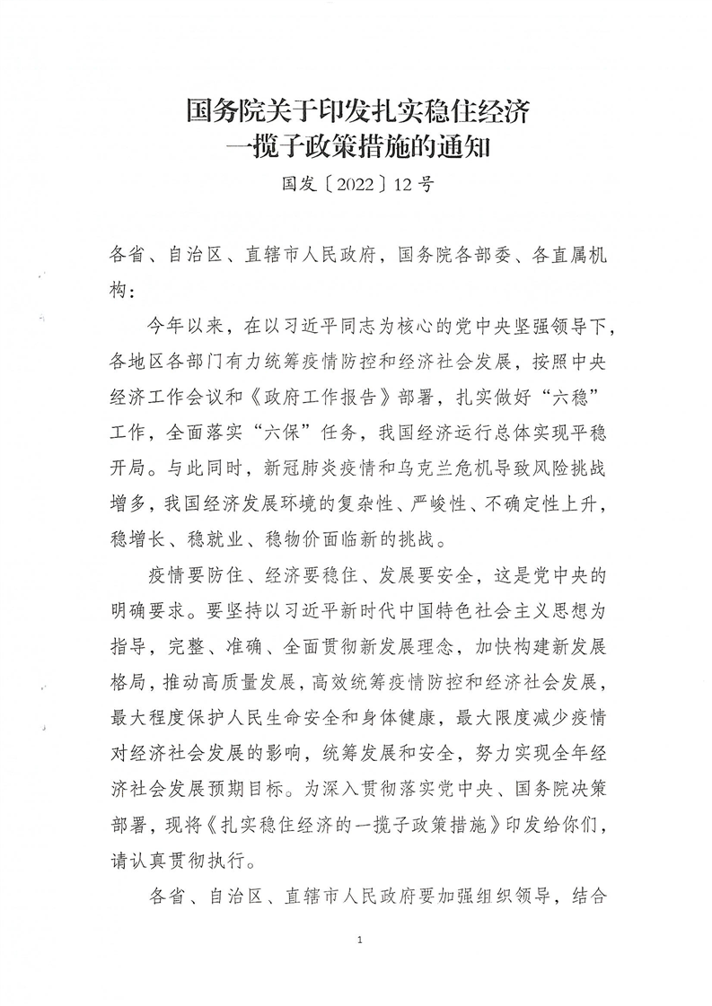 國務(wù)院關(guān)于印發(fā)扎實穩(wěn)住經(jīng)濟一攬子政策措施的通知
