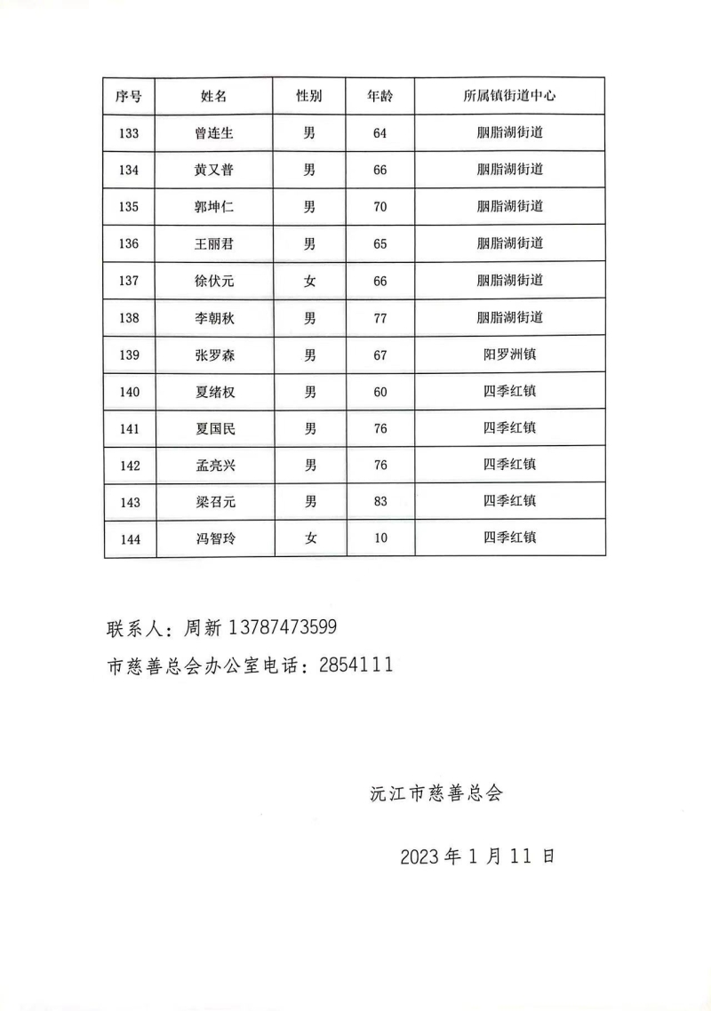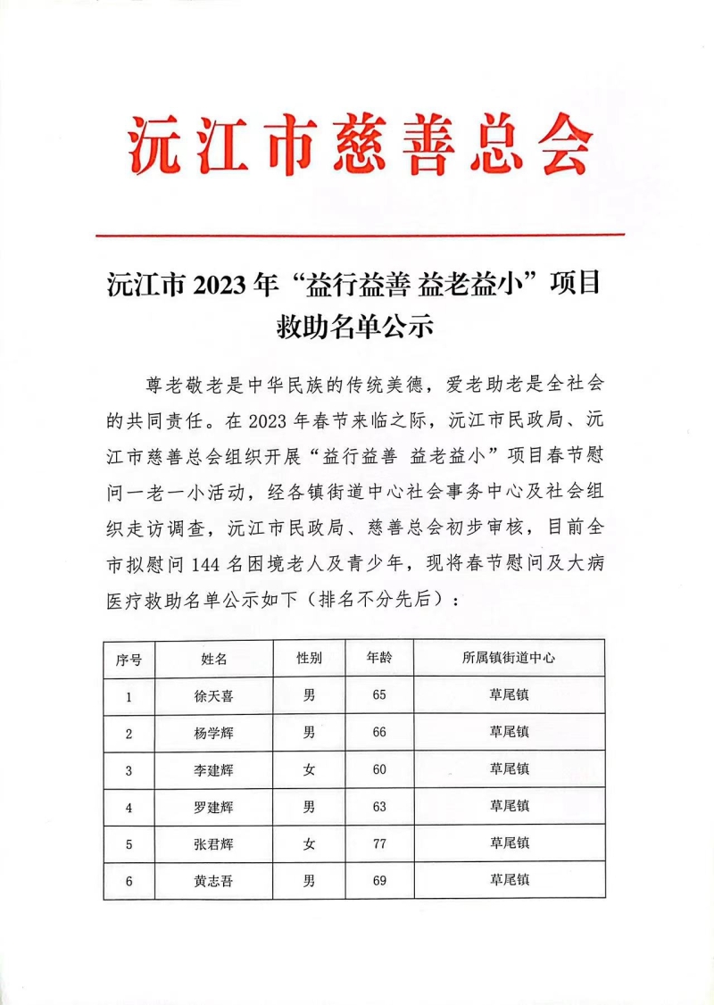 沅江市2023年“益行益善 益老益小”項目救助名單公示