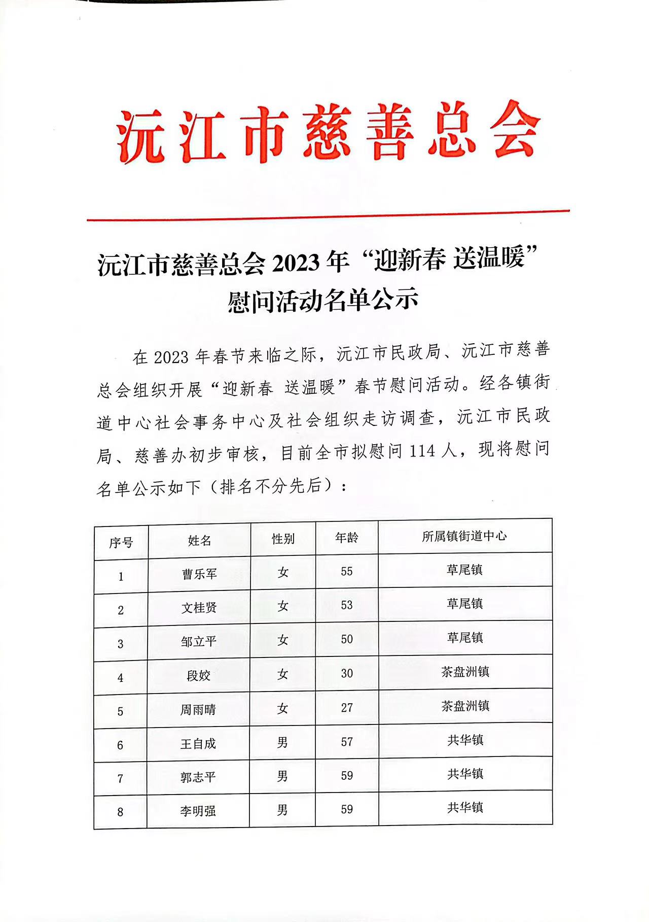 沅江市慈善總會(huì)2023年“迎新春 送溫暖”慰問活動(dòng)名單公示