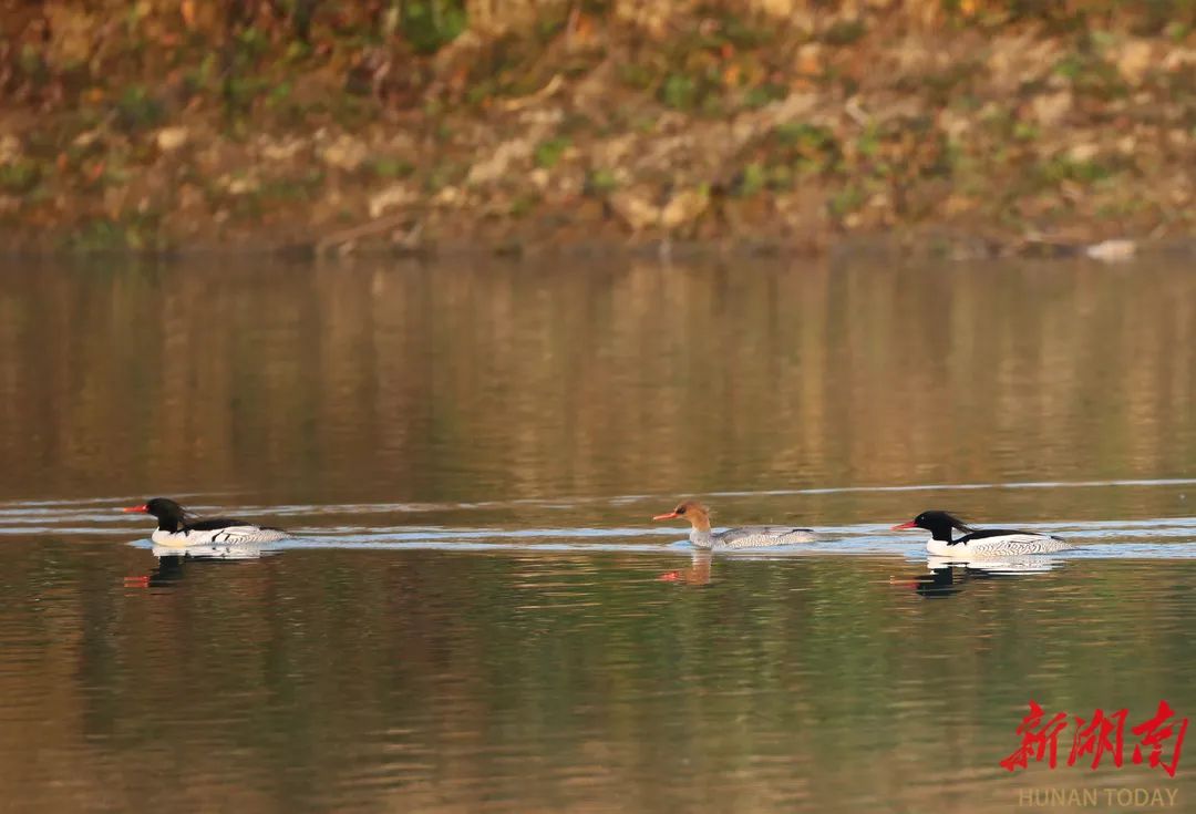 近日,湖南省野生動物保護協會副秘書長、沅江市環保志愿者協會會長李劍志沿沅江市瓊湖街道保民村北堤巡湖至車便湖,幸運地看到6只中華秋沙鴨在湖中棲息覓食。這是去年入冬以來,中華秋沙鴨出現在車便湖的首次記錄。