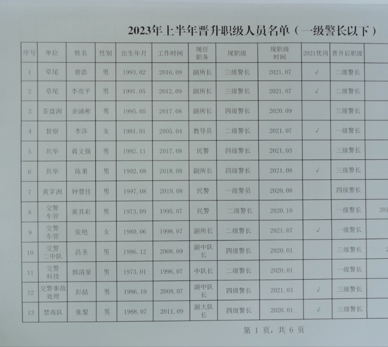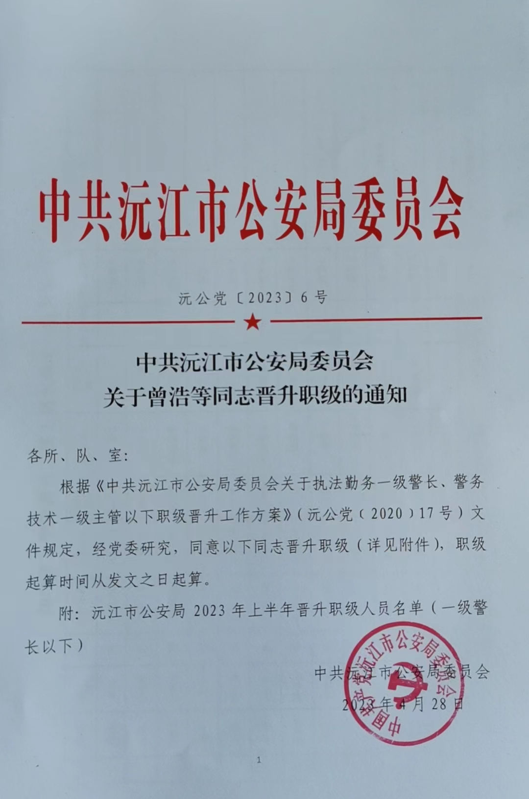 中共沅江市公安局委員會關(guān)于曾浩等同志晉升職級的通知