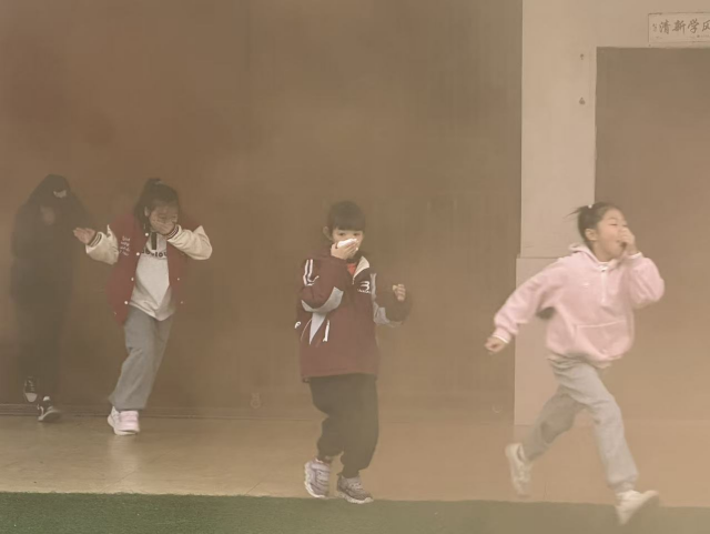 警報響起那一刻,各班學生反應迅速。在班主任的指揮下,孩子們用濕毛巾緊緊捂住口鼻,彎腰俯身,沿著預定路線快速向操場轉移。樓道里,學校安全員和教師們堅守在關鍵位置,確保疏散過程不擁擠、不慌亂。