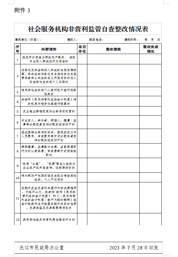 (二)摸底排查和自查自糾階段(9月20日前)。會同各業務主管單位(行業管理部門)部署各行業協會商會亂收費、社會服務機構非營利監管、非法社會組織、“僵尸型”社會組織清理情況是進行全面自查,對于自查出的違法違規情況由行業主管單位予以整治。