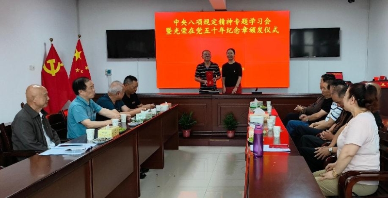 6月23日,市審計局舉行“光榮在黨50年”紀念章頒發儀式,局黨組成員、副局長彭華為老黨員曹金城同志頒發紀念章。