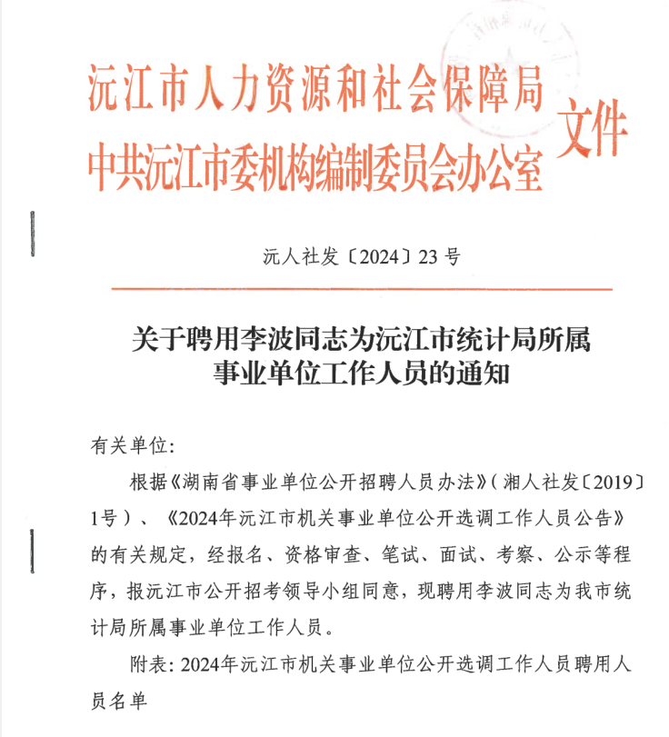 關于聘用李波同志為沅江市統計局所屬事業單位工作人員的通知
