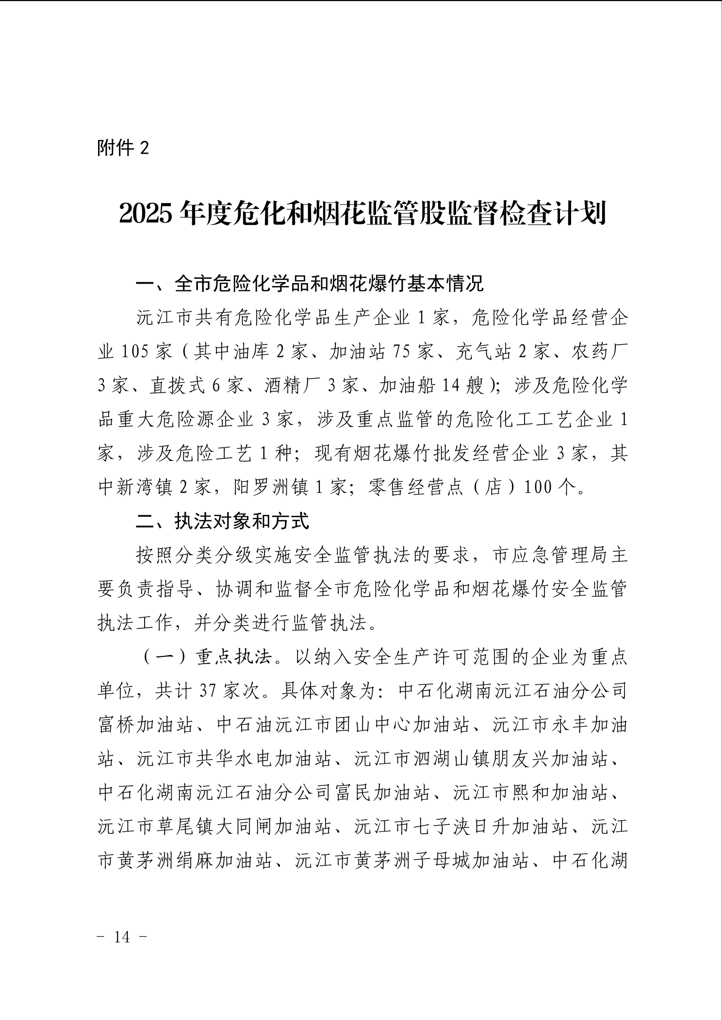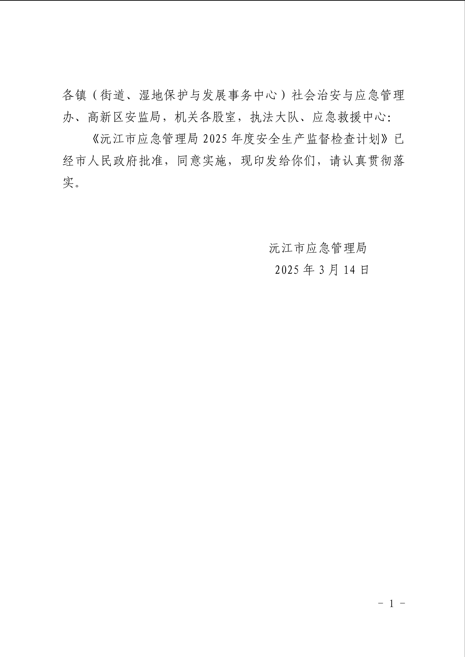 關于印發《沅江市應急管理局2025年度安全生產監督檢查計劃》的通知