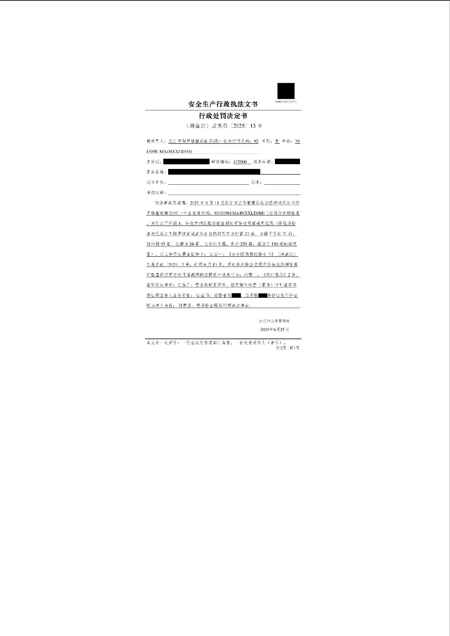 行政處罰決定書公示(湘益沅)應(yīng)急罰〔2025〕12號