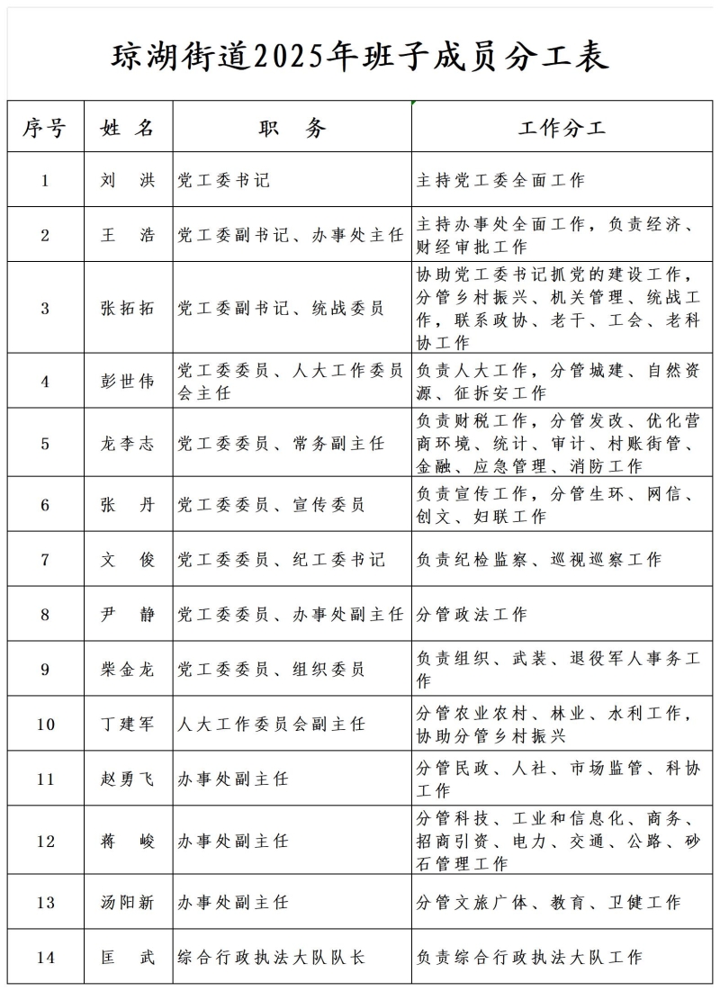 瓊湖街道辦事處班子成員分工表(2025.02)