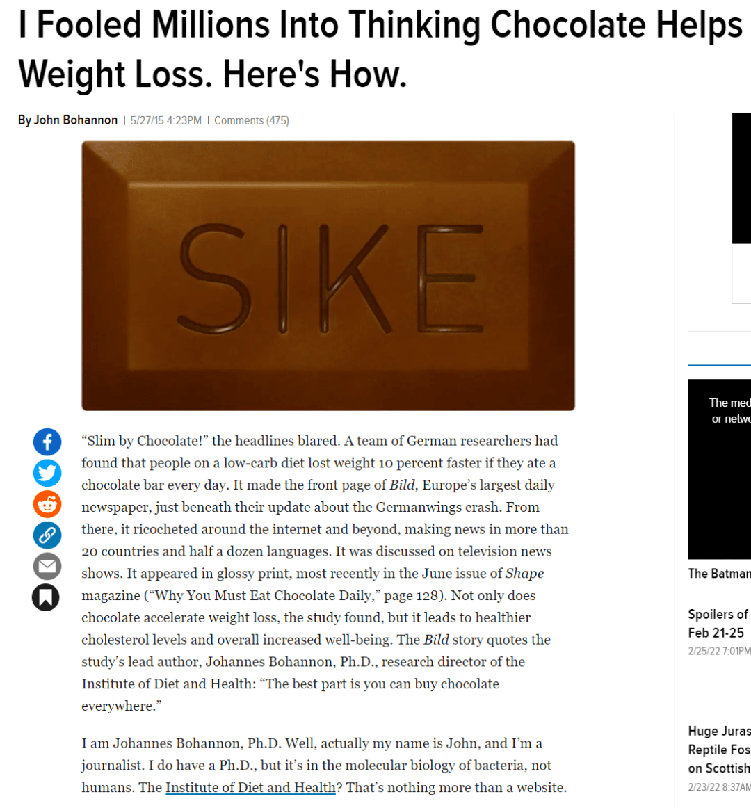 其實(shí),關(guān)于吃黑巧克力能減肥這件事只是一個(gè)并不嚴(yán)謹(jǐn)?shù)膫餮远选_@項(xiàng)研究來自于一位德國(guó)的Johannes Bohannon博士,它并不是該方面領(lǐng)域的專家,而是細(xì)菌分子生物學(xué)方面的博士。一篇國(guó)外的文章中寫到了他對(duì)“吃黑巧克力減肥”這件事情的綜述。