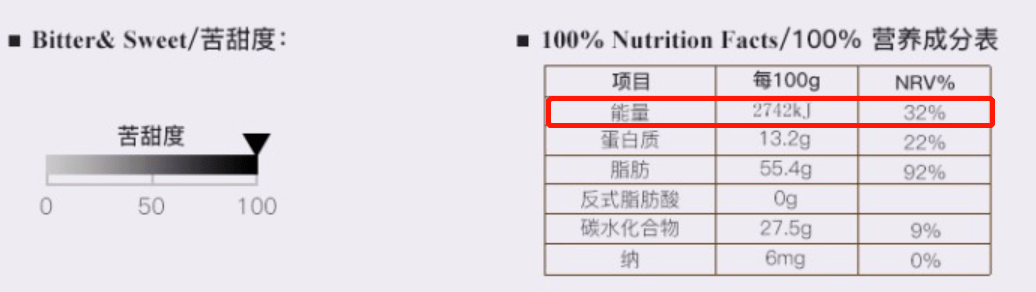 巧克力的熱量是真的高!就比如下圖這款沒有添加糖的純100%黑巧克力,100克的熱量是2742千焦,折合為約655千卡,即便只是吃50克,也會(huì)攝入328千卡的熱量,相當(dāng)于兩碗米飯了。