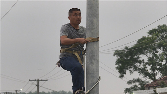 7月12日傍晚,在紅旗電排附近,吳映輝和他的同事正在搶架臨時照明線路。吳映輝告訴記者,自7月2日,他們對全垸照明燈具進行檢查,更換幾百盞照明燈,確保防汛工作的照明需要。
