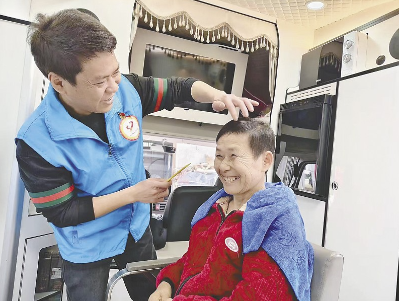 鄉(xiāng)間的路不好走,房車體型又較大,康冬平開得小心翼翼,用了20多分鐘。吳元珍知道他要來,早早就在盼著。康冬平和她的丈夫黃安建小心地將她抬上房車,“康師傅,你這車太干凈了,要不還是在家里剪,怕弄臟了車子……”吳元珍有些過意不去。康冬平笑著打斷了她的話:“您放松下來,好好享受就是。”