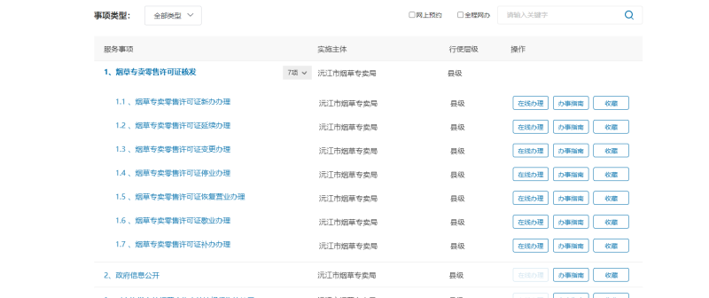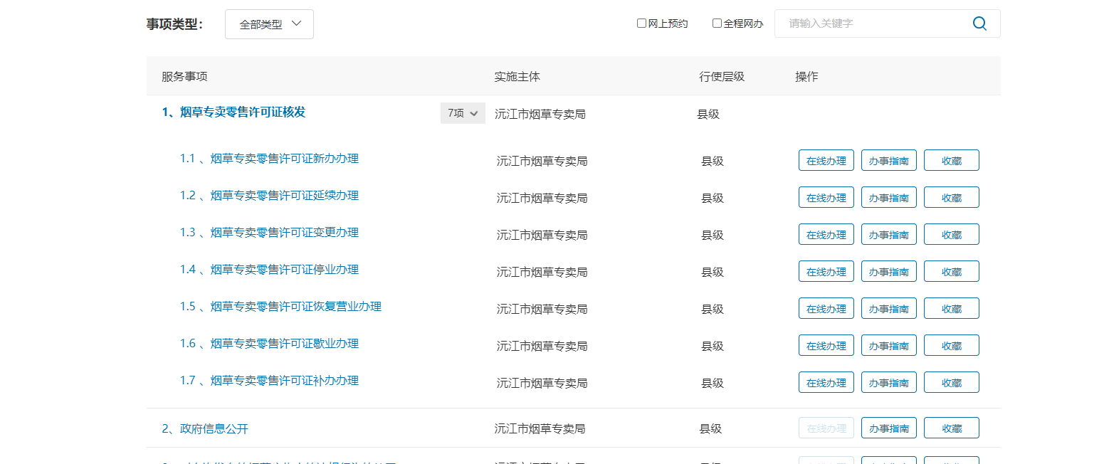 5.登錄“湖南省一件事一次辦”(http://zwfw-new.hunan.gov.cn)-切換沅江市-煙草專賣局辦理煙草證新辦、延續(xù)、變更、補辦、歇業(yè)、停業(yè)、恢復(fù)營業(yè)等有關(guān)業(yè)務(wù)。