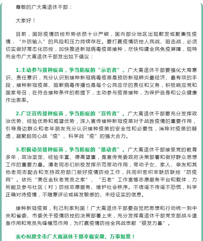 致全市離退休干部接種新冠疫苗的倡議書