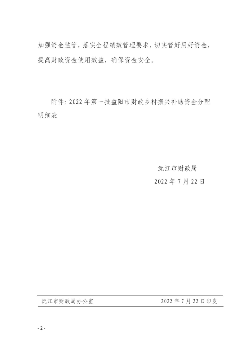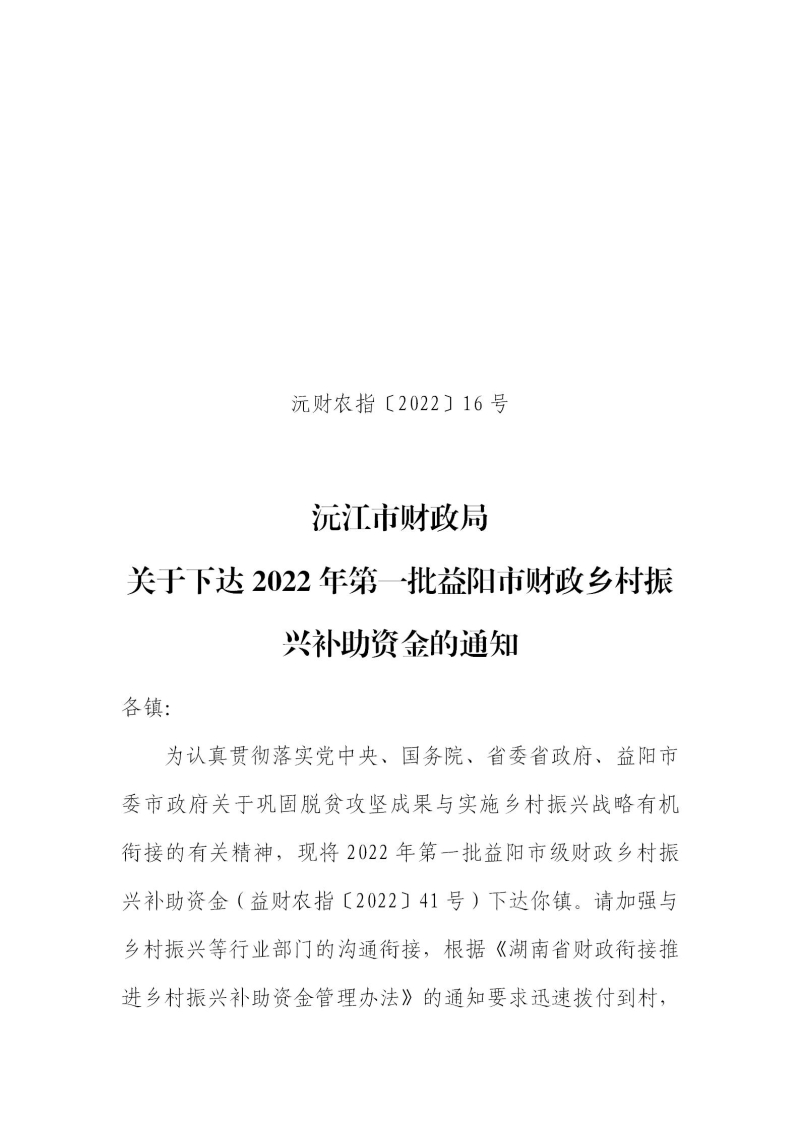 沅財農(nóng)指〔2022〕16號 沅江市財政局關(guān)于下達2022年第一批益陽市財政鄉(xiāng)村振興補助資金的通知.pdf 2022年第一批益陽市財政鄉(xiāng)村振興補助資金分配明細表.xlsx