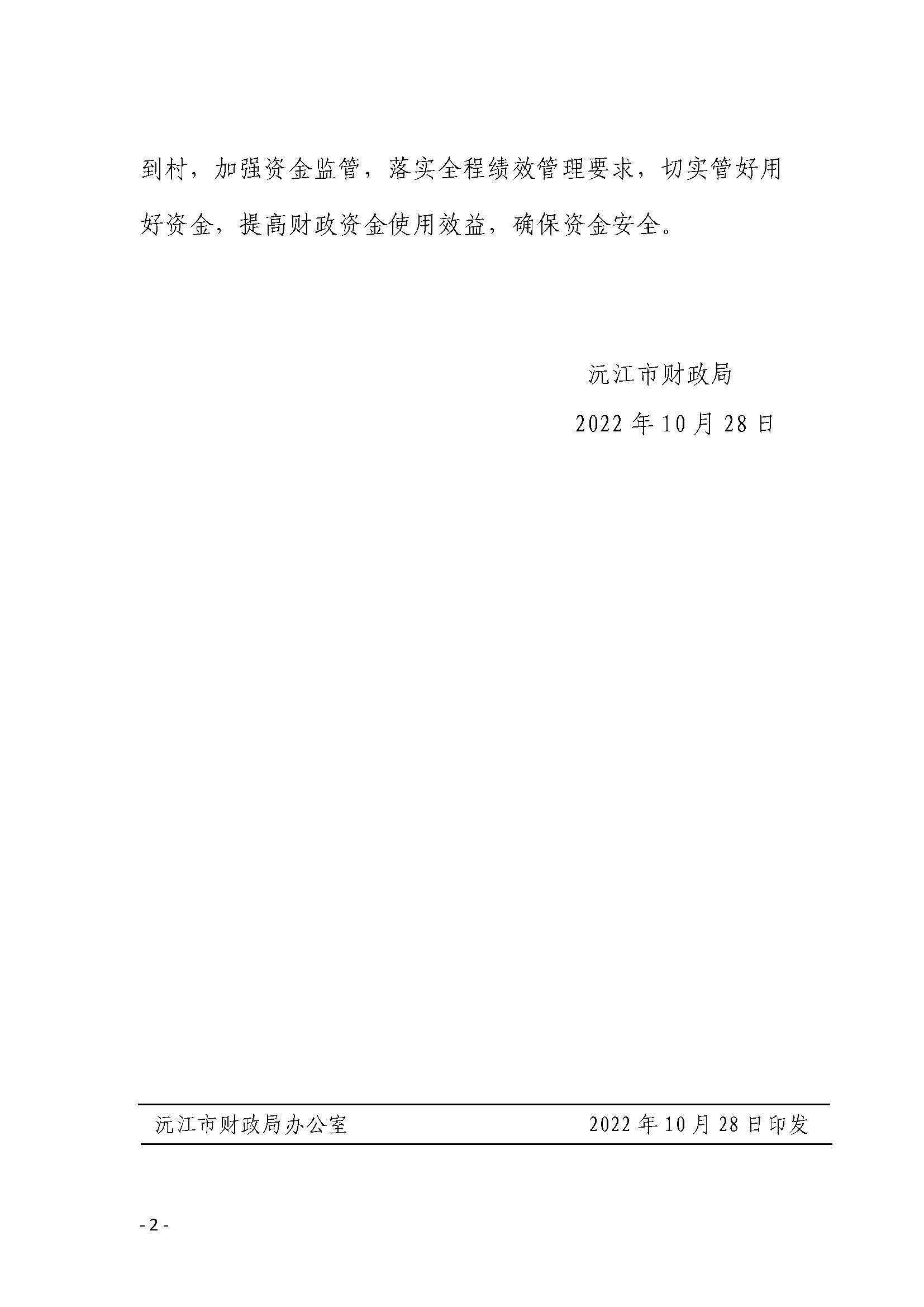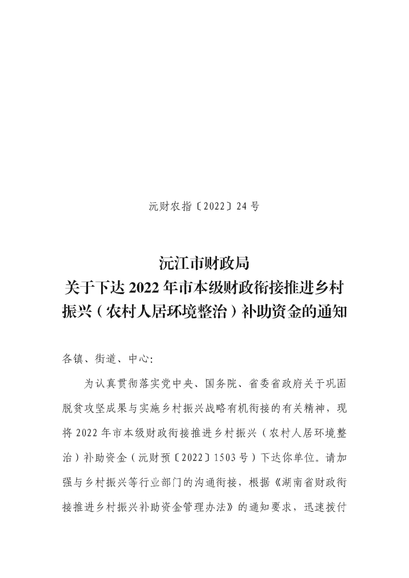 沅財農指〔2022〕24號 關于下達2022年市本級財政銜接推進鄉村振興(農村人居環境整治)補助資金的通知