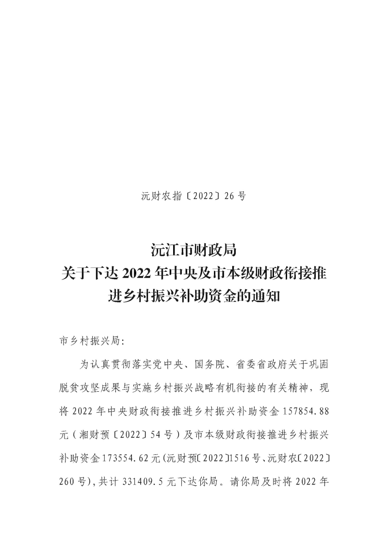 沅財農指〔2022〕26號 沅江市財政局關于下達2022年中央及市本級財政銜接推進鄉(xiāng)村振興補助資金的通知