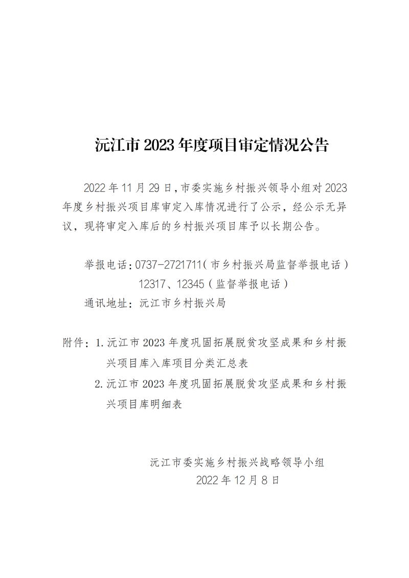 沅江市2023年度項目審定情況公告