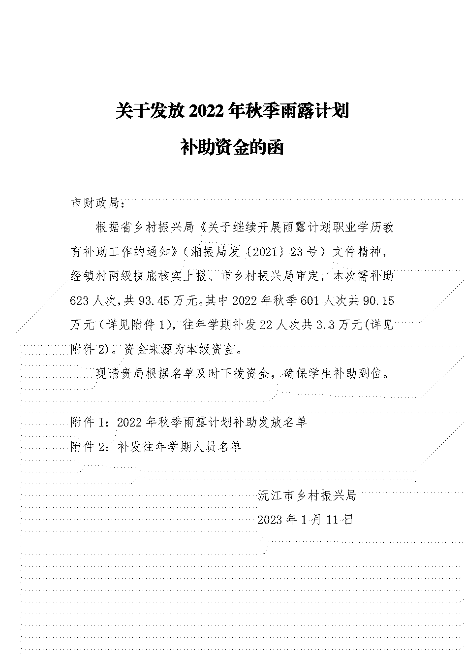 關(guān)于發(fā)放2022年秋季雨露計劃補助資金的函