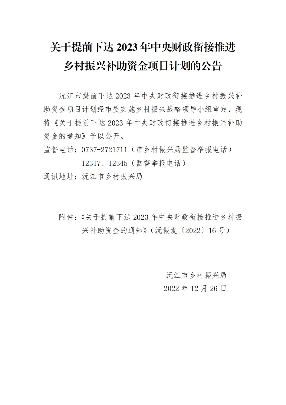 關于提前下達2023年中央財政銜接推進鄉(xiāng)村振興補助資金項目計劃的公告