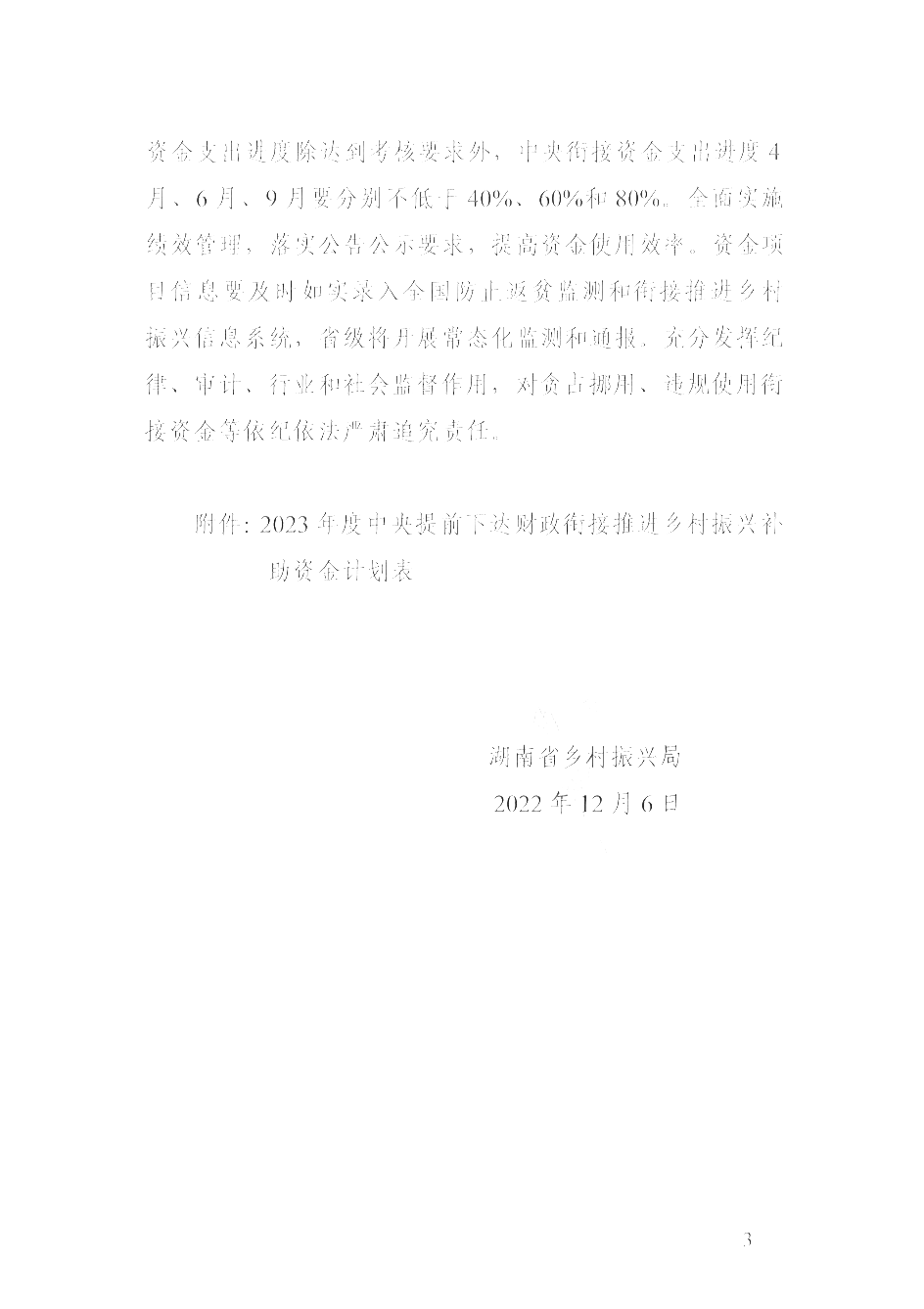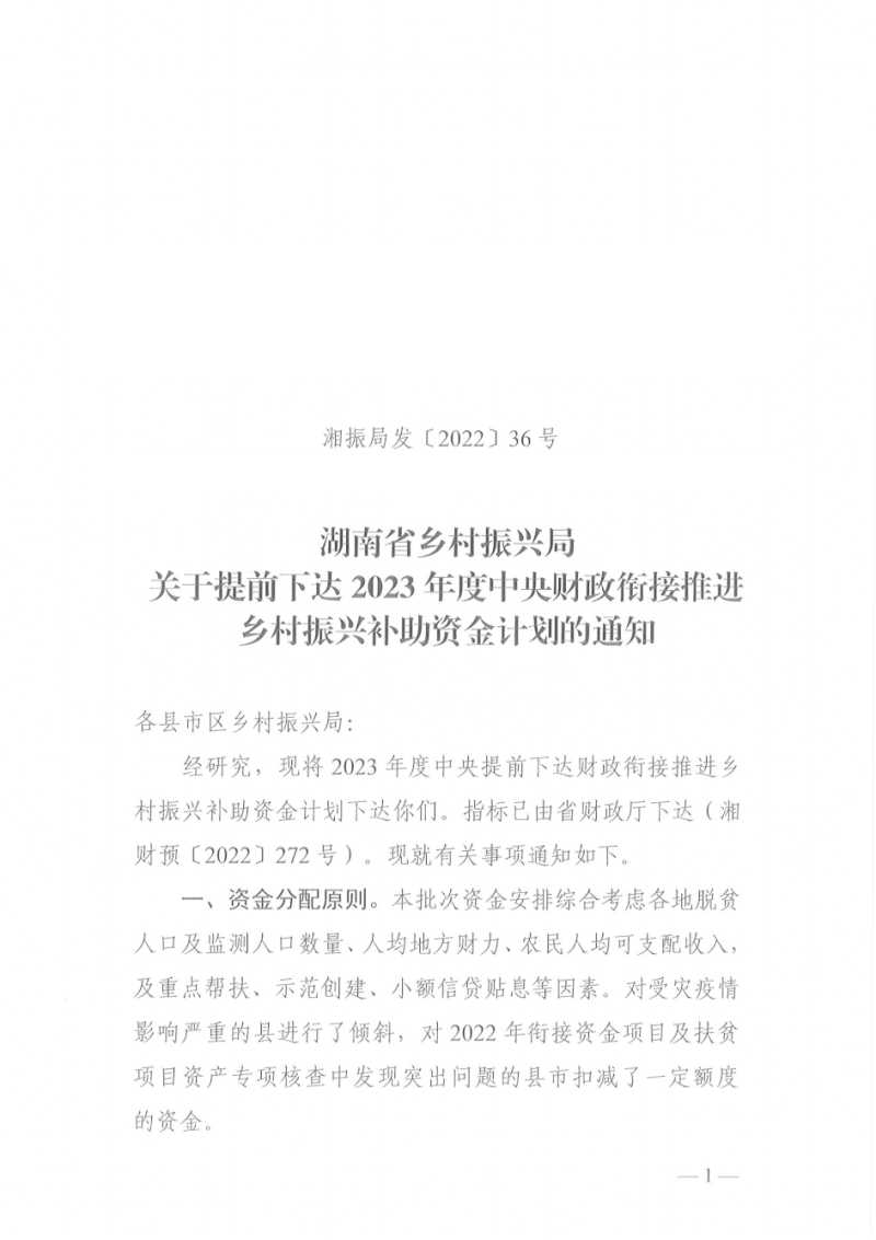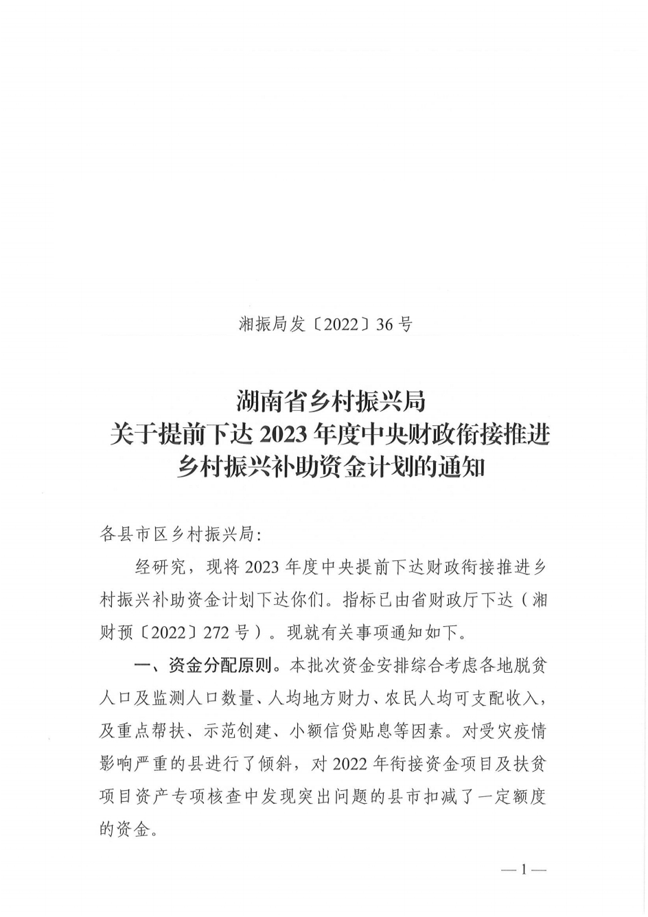 湘振局發(fā)〔2022〕36號(hào)關(guān)于提前下達(dá)2023年度中央銜接資金計(jì)劃的通知