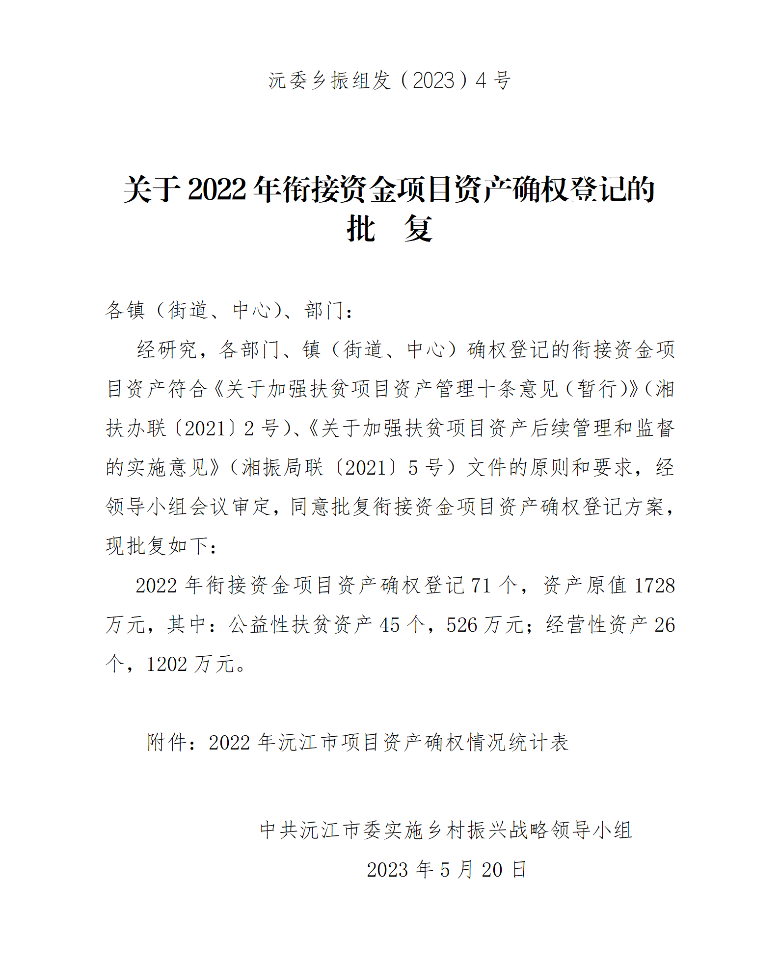 沅委鄉(xiāng)振組發(fā)(2023)4號(hào)關(guān)于2022年銜接資金項(xiàng)目資產(chǎn)確權(quán)登記的批復(fù)