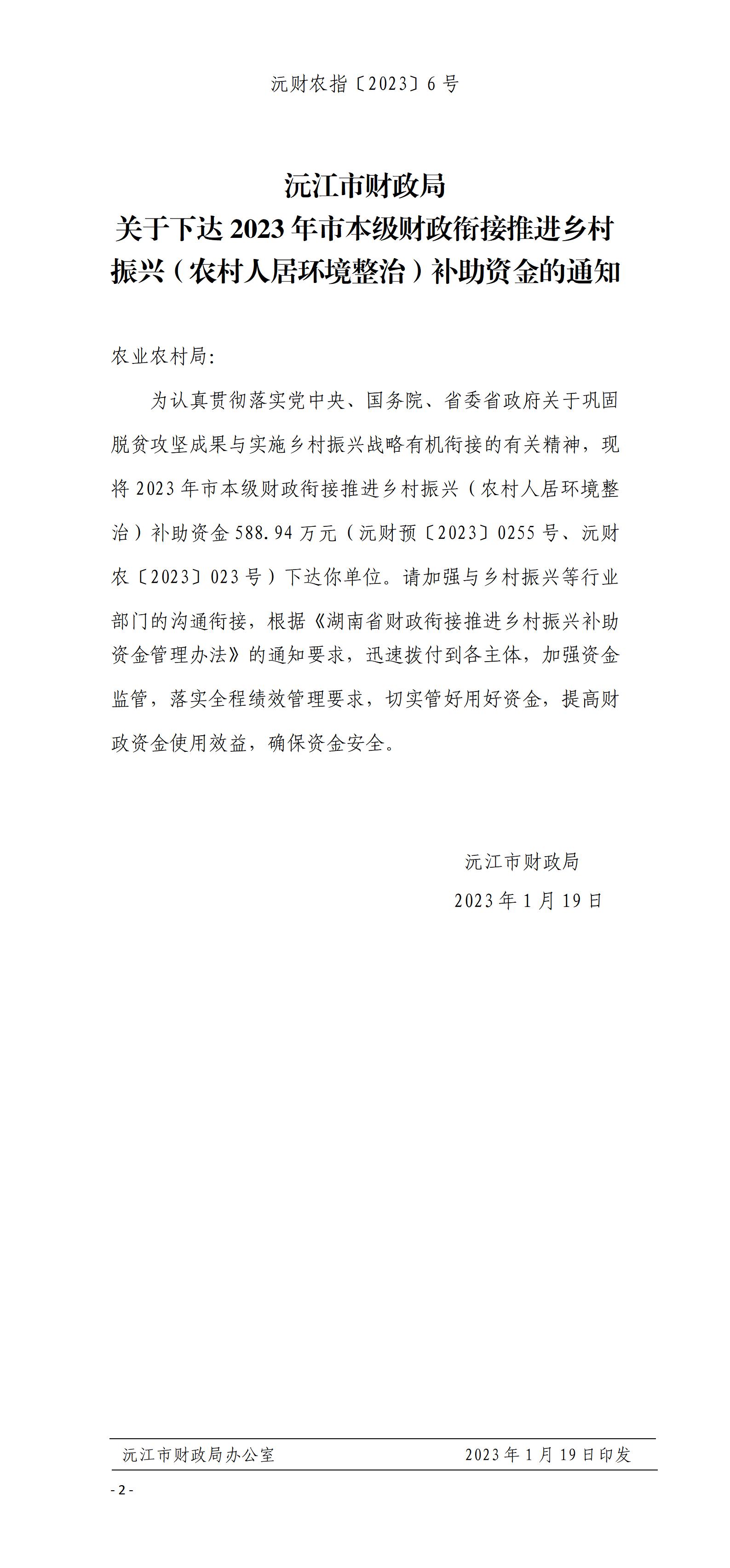 沅財農指〔2023〕6號關于下達2023年市本級財政銜接推進鄉村振興(農村人居環境整治)補助資金的通知