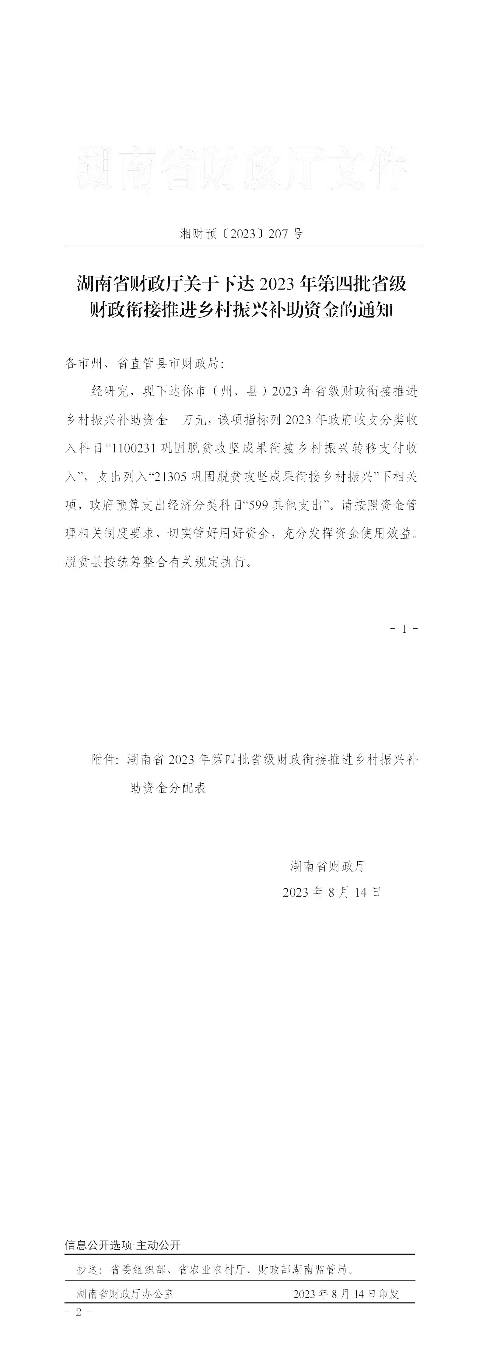 湘財預(2023)207號關于下達2023年第四批省級財政銜接推進鄉村振興補助資金的通知