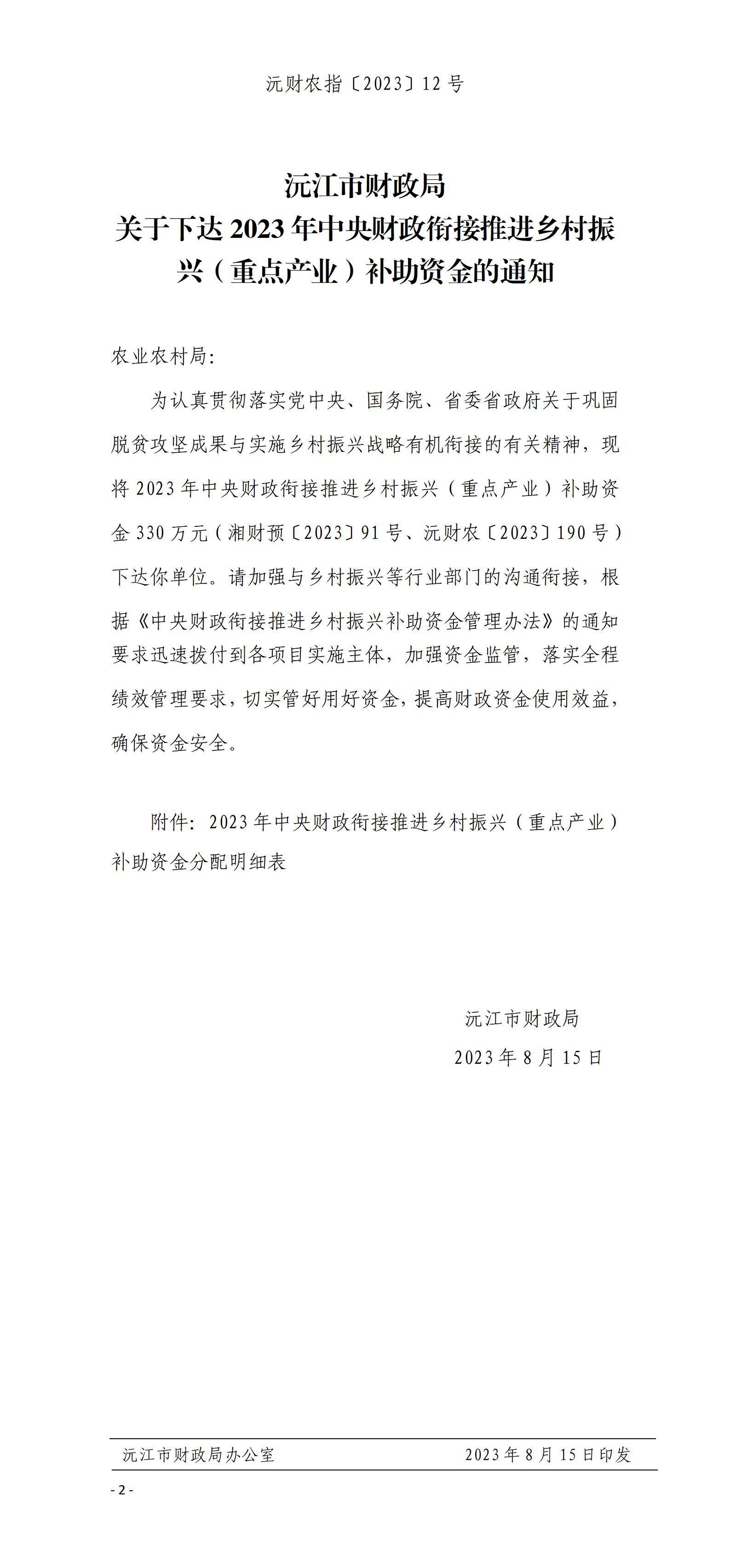 沅財農指〔2023〕12號 沅江市財政局 關于下達2023年中央財政銜接推進鄉村振興(重點產業)補助資金的通知