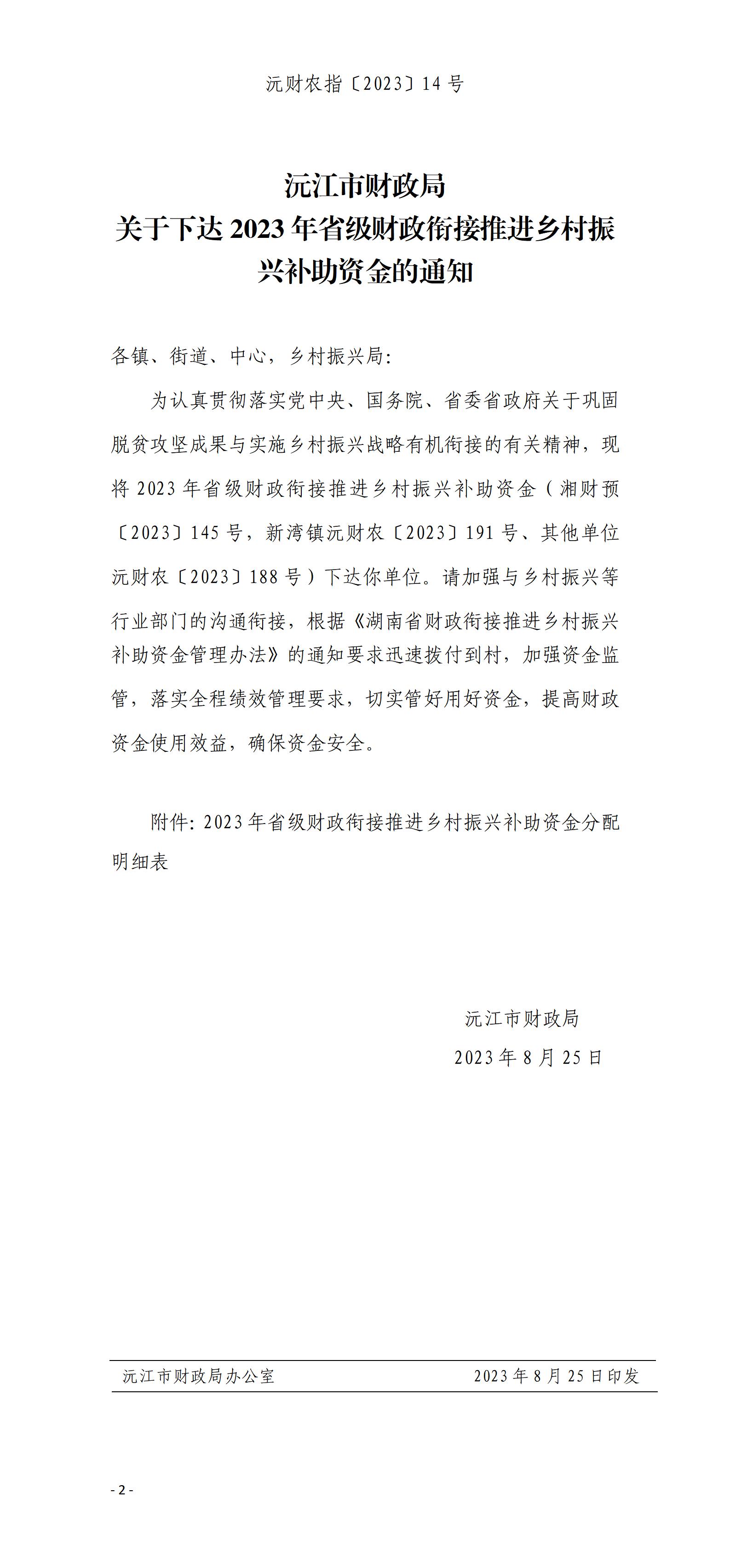沅財農指〔2023〕14號 沅江市財政局 關于下達2023年省級財政銜接推進鄉村振興補助資金的通知
