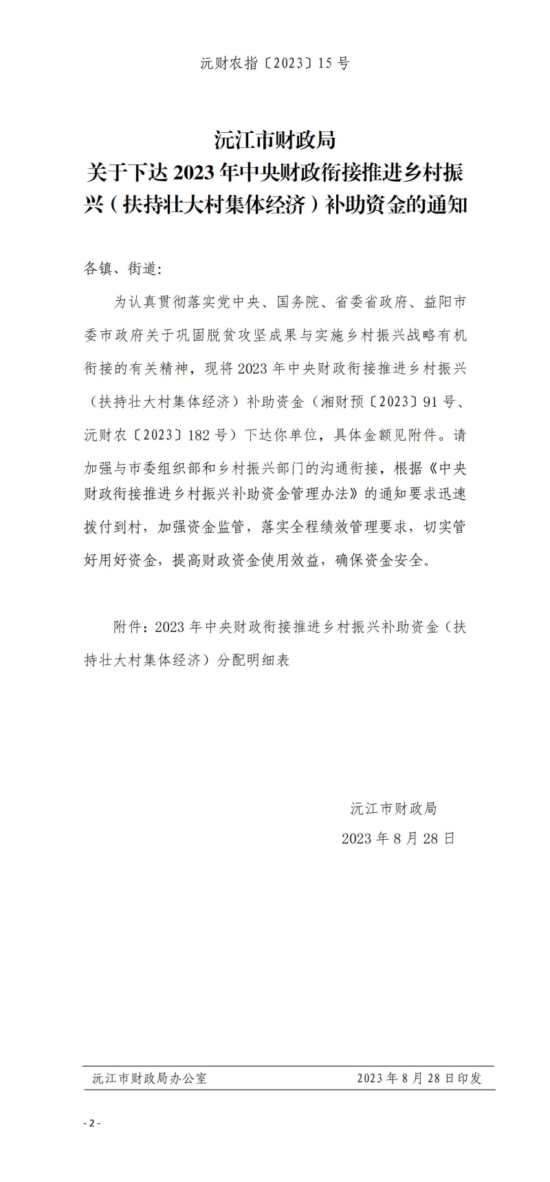 沅財農指〔2023〕15號 沅江市財政局 關于下達2023年中央財政銜接推進鄉村振興(扶持壯大村集體經濟)補助資金的通知
