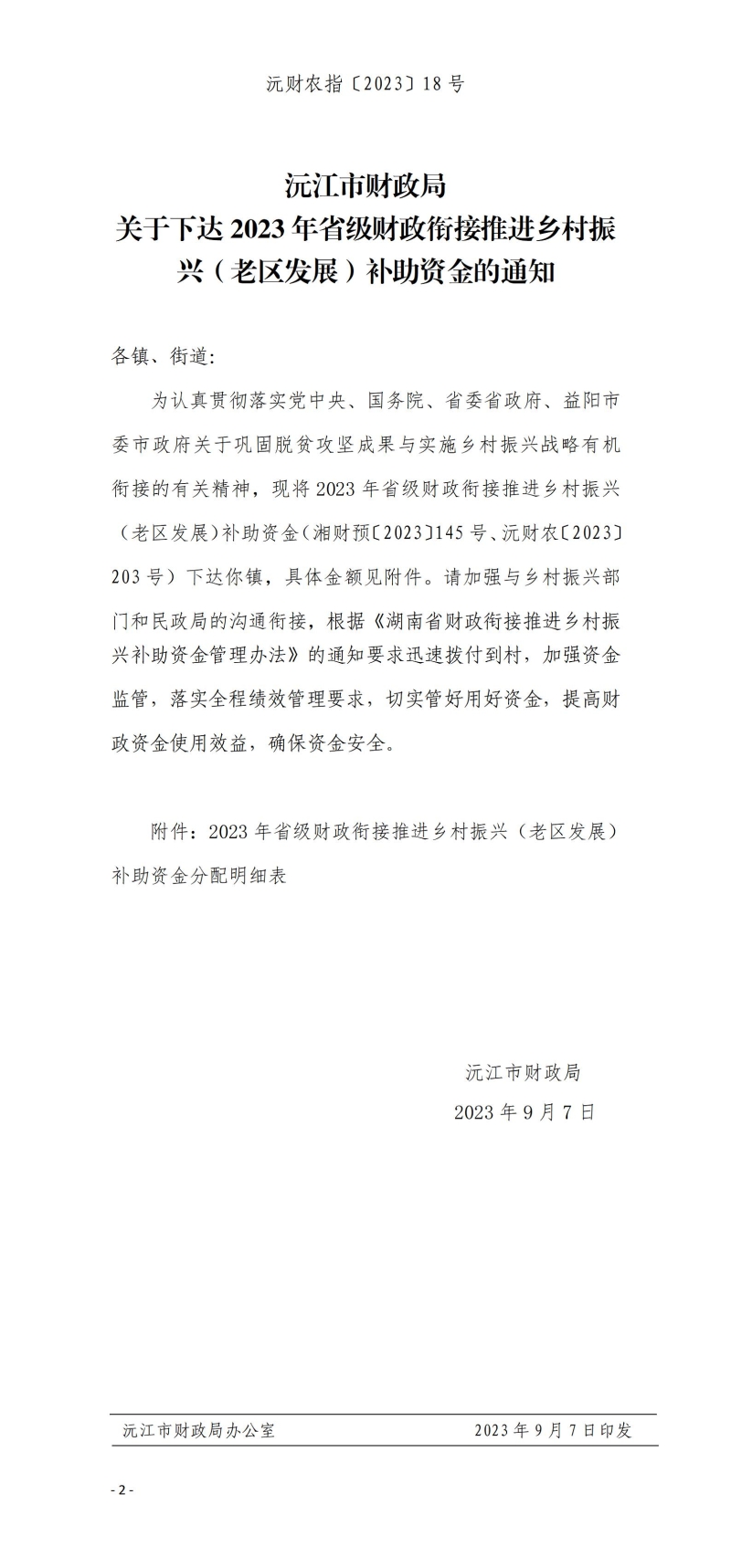 沅財農指〔2023〕18號 沅江市財政局 關于下達2023年省級財政銜接推進鄉村振興(老區發展)補助資金的通知
