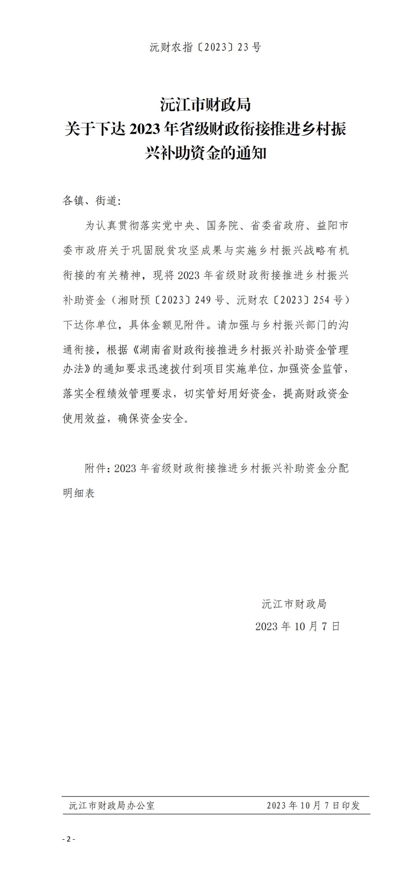 沅財農指〔2023〕23號沅江市財政局 關于下達2023年省級財政銜接推進鄉村振興補助資金的通知