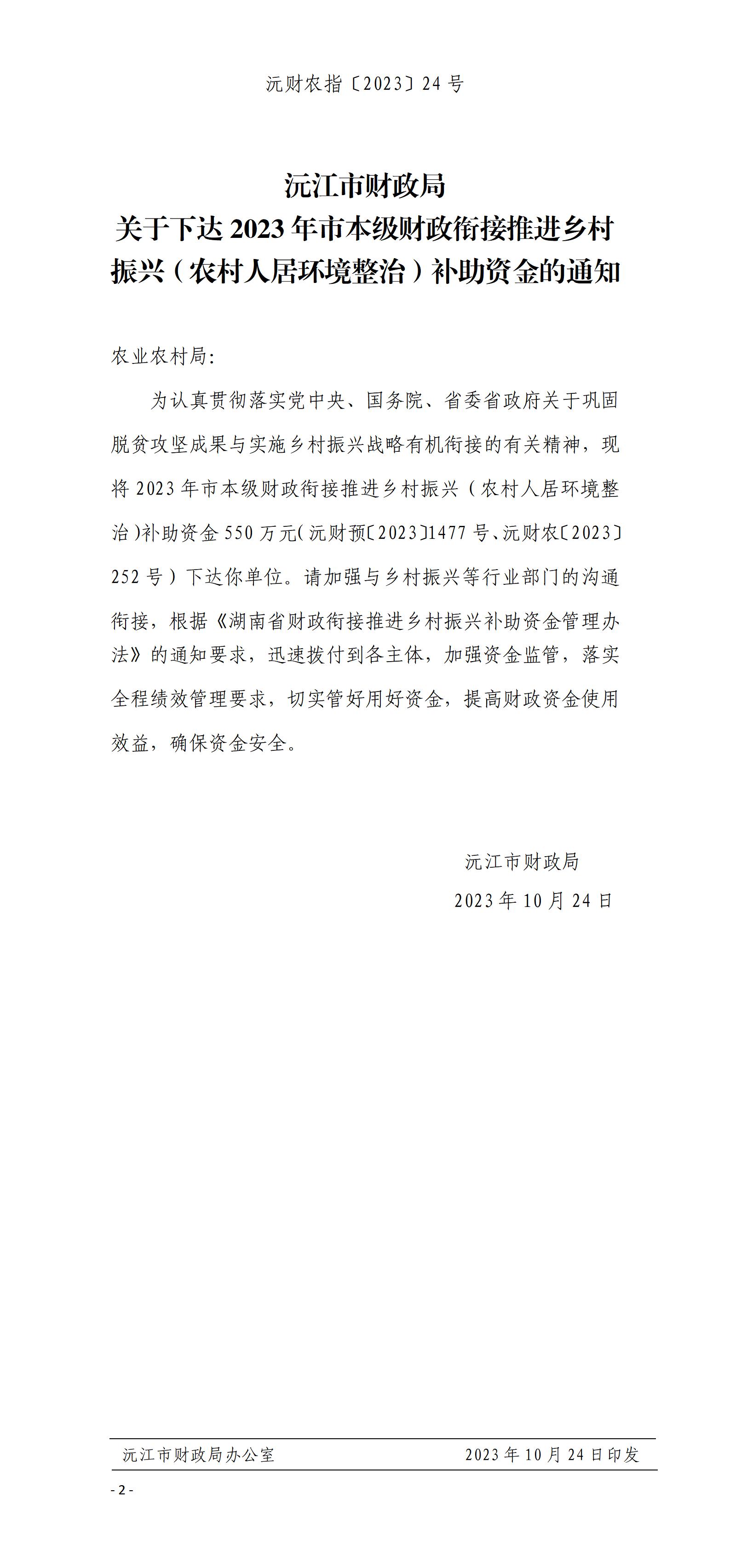 沅財農指〔2023〕24號沅江市財政局 關于下達2023年市本級財政銜接推進鄉村振興(農村人居環境整治)補助資金的通知