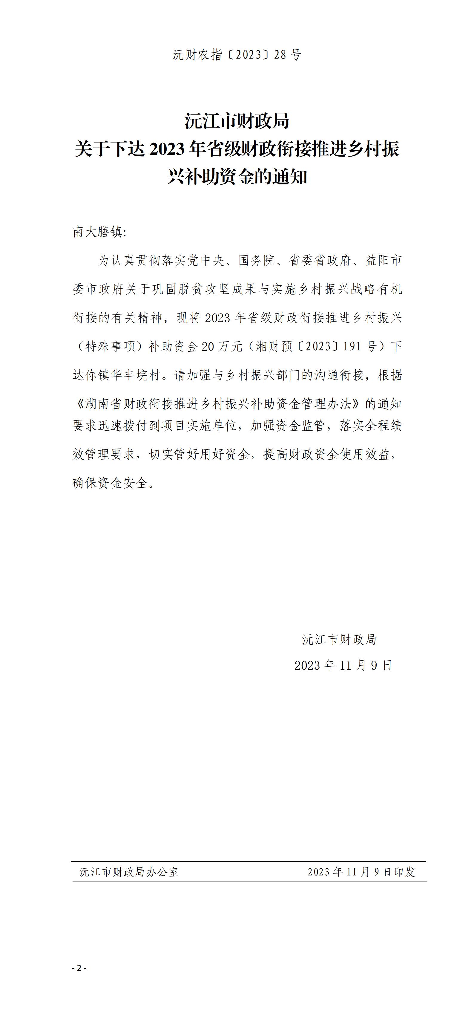 沅財農指〔2023〕28號沅江市財政局 關于下達2023年省級財政銜接推進鄉村振興補助資金的通知