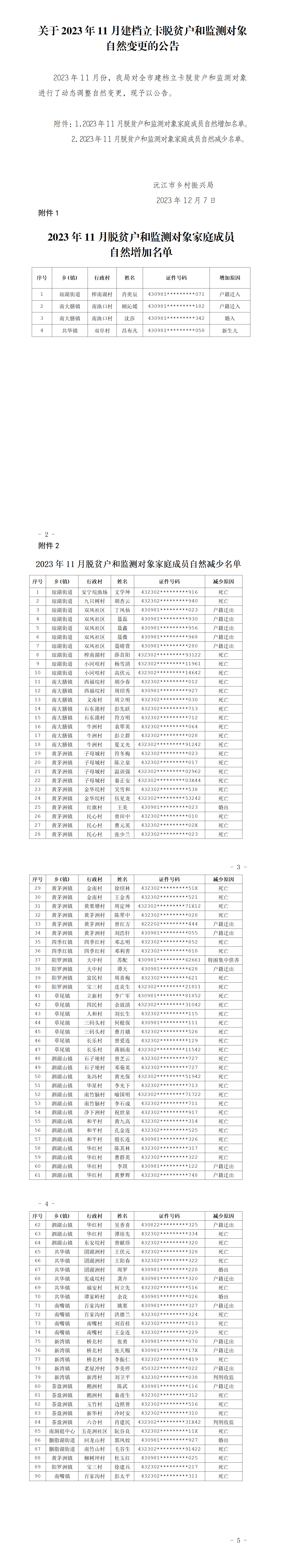 關于2023年11月建檔立卡脫貧戶和監測對象自然變更的公告