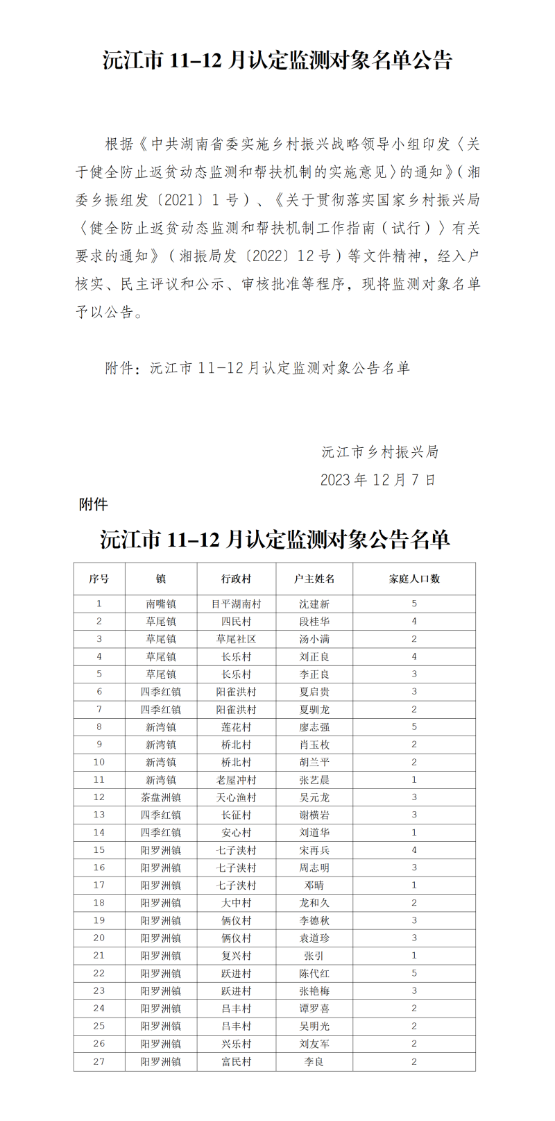 沅江市11-12月認(rèn)定監(jiān)測(cè)對(duì)象名單公告