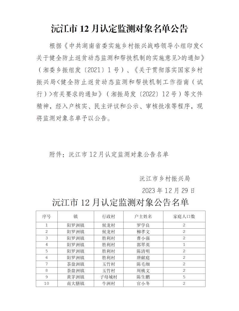 沅江市12月認(rèn)定監(jiān)測對象名單公告