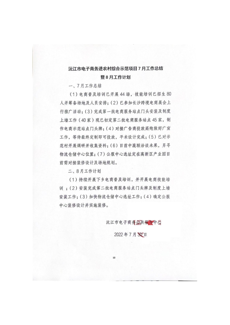 沅江市電子商務進農村綜合示范項目7月工作總結暨8月工作計劃