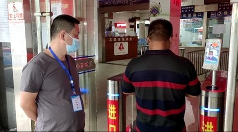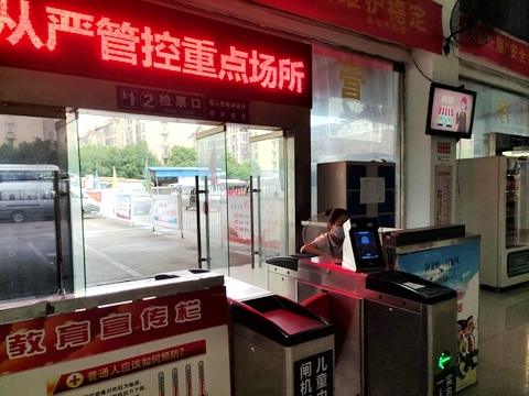在市百合汽車站入口處,一臺健康碼識別機和紅外線測溫設備,正自動查驗旅客三碼、測量旅客體溫,確保有進必檢,不漏一人。