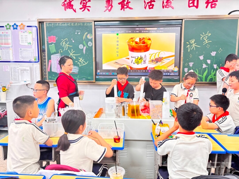 活動中,家長們精心準備,帶著裝滿童年記憶的“百寶箱”走進教室,向孩子們介紹爸爸媽媽小時候的玩具和游戲,帶領孩子們來到操場,親身體驗滾鐵環、抽陀螺、丟手絹等傳統游戲。此外,家長們還教孩子們制作各種美食:精致小巧的壽司、清爽可口的涼粉、香氣四溢的檸檬茶、酸辣開胃的涼拌菜等,不僅滿足了孩子們的味蕾,更讓他們在動手實踐中收獲了快樂與成長。